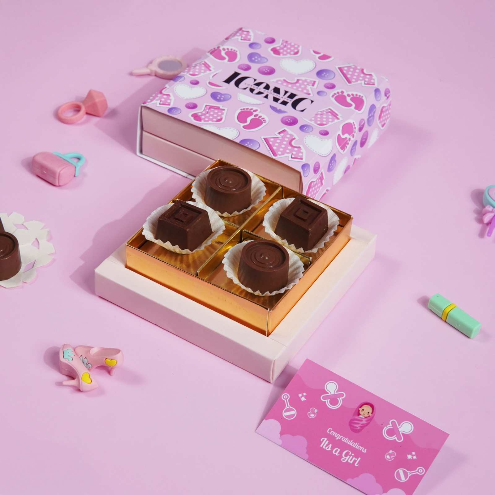 Celebrate the arrival of a precious little princess with our Rosé Blossom Delight Box — a charming blush-pink keepsake filled with 4 handcrafted premium chocolates in assorted flavors. Perfect as a birth announcement giveaway or a thoughtful gift for loved ones welcoming their newborn baby girl.