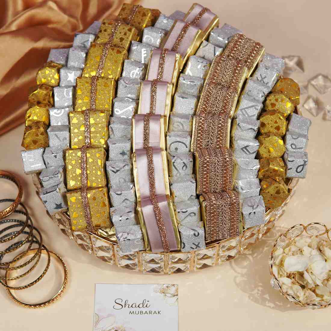 Presented on a stunning Gold Diamond Platter, this breathtaking arrangement of 85 handcrafted chocolates is designed to be the crown jewel of any celebration. Resting on a grand circular base of decorative crystalline material that shimmers like a treasure chest of precious gems, each chocolate is wrapped in a striking mix of gold and silver — the gold pieces radiating with a brilliant metallic sheen and the silver adorned with intricate embossed detailing. Perfect for weddings, grand festivities, or as an unforgettable gift, the Gold Diamond Platter comes complete with a “Shadi Mubarak” card, making it a true statement of taste, celebration, and love. A masterpiece of indulgence and artistry, this platter isn’t just a gift, it’s an Iconic experience.